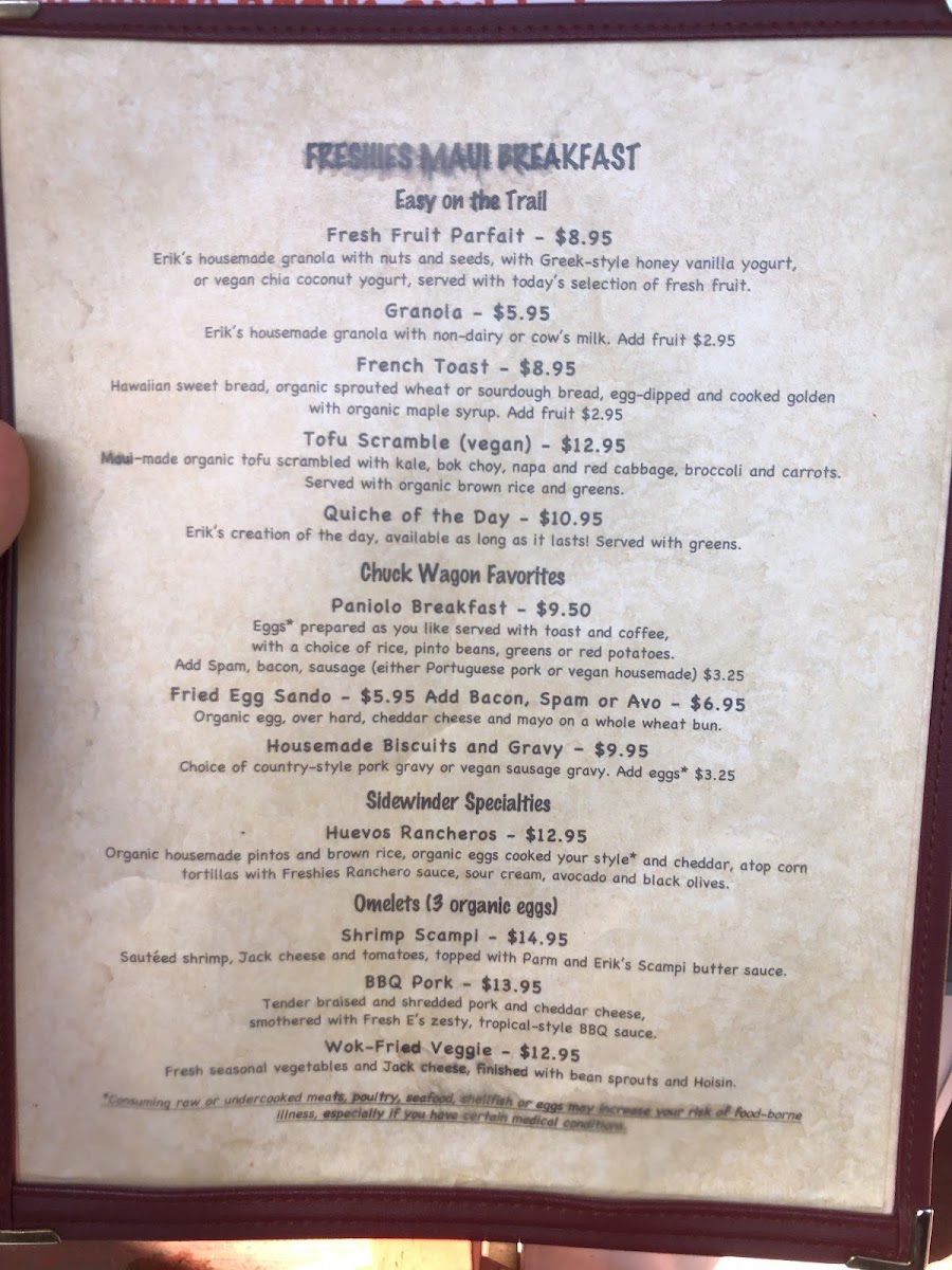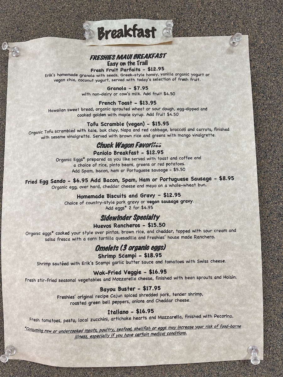 Nestled in the heart of Makawao, Freshies Maui delights with a menu that celebrates local flavors and wholesome ingredients. The offerings are diverse, catering to both meat lovers and vegetarians alike. For lunch, indulge in their Lean and Mean Tofu Chili served with savory cheddar and onions, or opt for the vibrant Upcountry Veggie Sando, showcasing marinated tofu and fresh veggies piled high on a locally made hoagie roll.